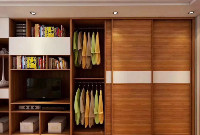 如果衣柜中間正好安置了電視機,電視機柜高度離地至少不低于450mm,通常以600mm~750mm為宜,而考慮到散熱空間,最好柜體高度保持在900mm。