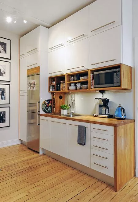 如果你實在是不喜歡把烤箱裝到吊柜上(因為要往上操作,不太方便)……不妨把烤箱放在臺面和墻體的角落位置,然后做一個和臺面相接的柜子,這樣整體上就會整齊很多。