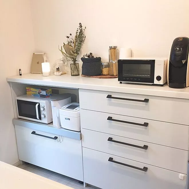 我們不僅可以通過吊柜留空,來為電器找到一個容身之所,同樣的,地柜也可以留空,方便物品的收納取用。