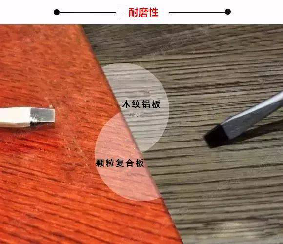 同樣用螺絲刀來磨蹭,顆粒復(fù)合板家居有明顯的劃痕,而木紋鋁板家居沒受到絲毫傷害,明顯木紋鋁板家居耐磨性遠高于顆粒復(fù)合板家居。