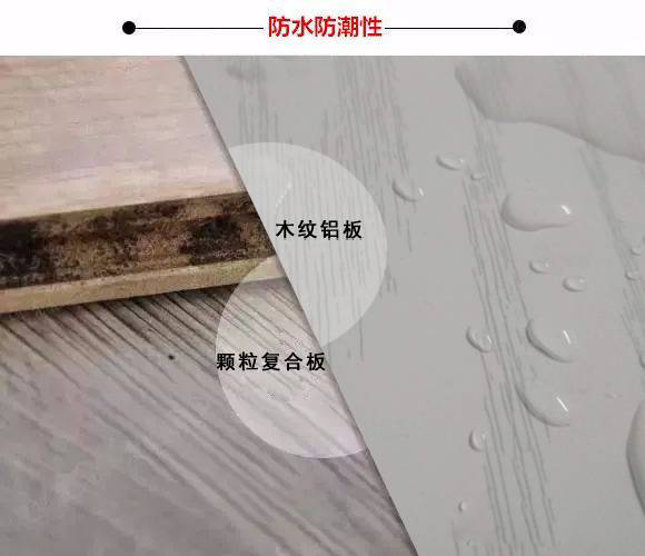 同樣的水倒在木紋鋁板家居和顆粒復(fù)合板家居的背面,木木紋鋁板家居沒有吸水現(xiàn)象,用紙擦拭什么水痕跡都沒有留下,而顆粒復(fù)合板家居則相反,說明木紋鋁板家居防水防潮性能良好
