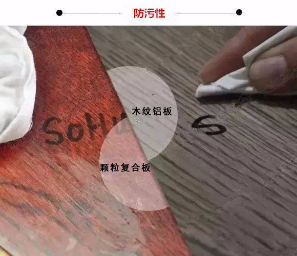 在木紋鋁板家居和顆粒復(fù)合板家居上寫字,木紋鋁板家居輕松的用抹布擦掉,不留痕跡,而顆粒復(fù)合板家居用濕毛巾擦拭,仍有明顯的字跡,明顯木紋鋁板家居的防污性強于顆粒復(fù)合板家居。