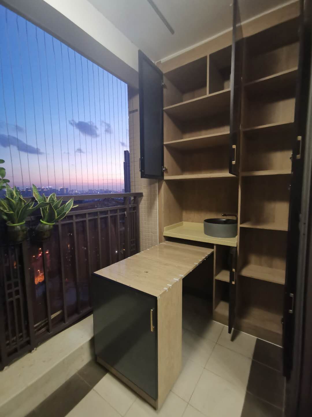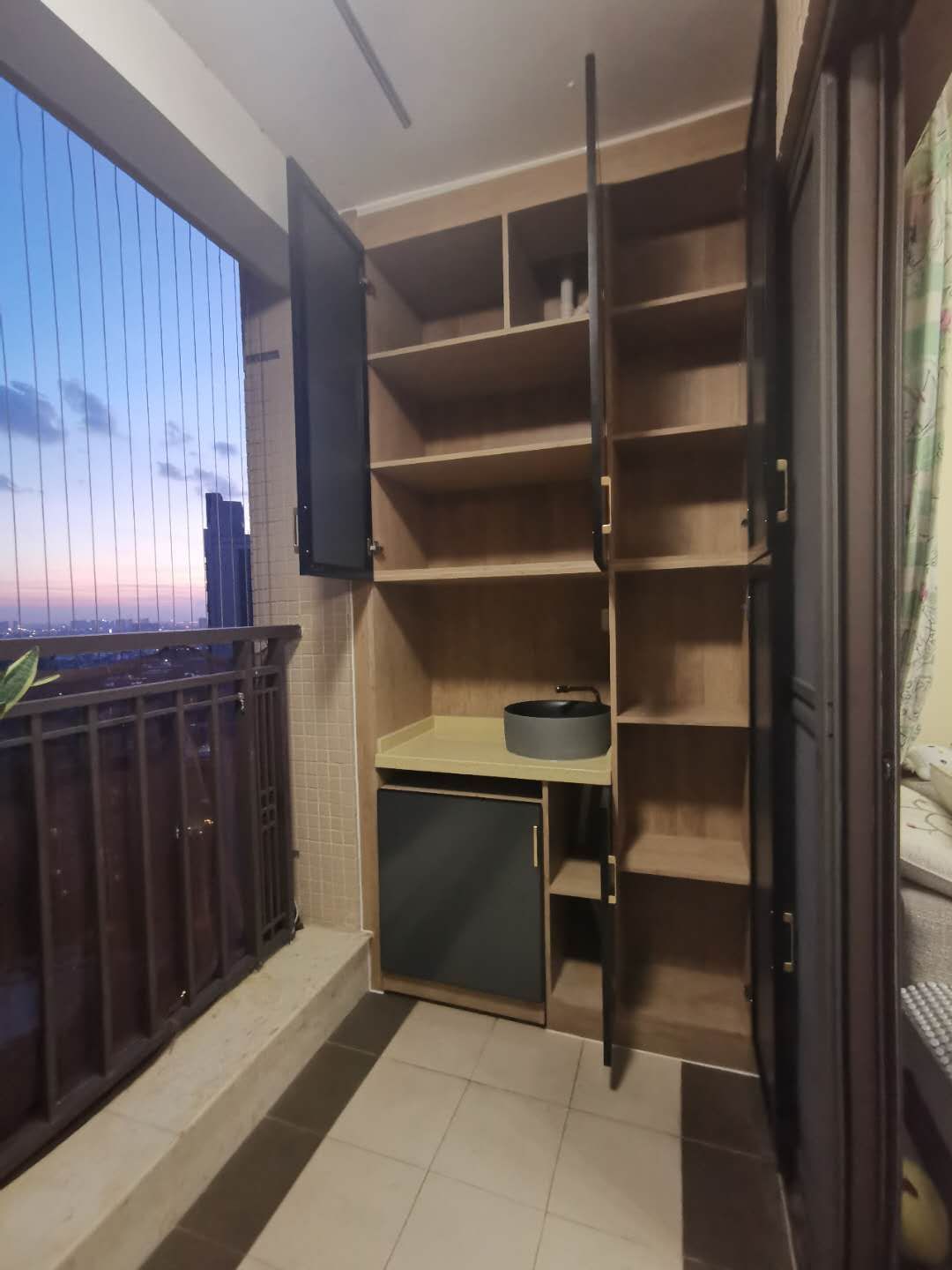 柜體用的是整板北歐榆木,柜門用的是輕奢風的極簡窄邊門,星空灰的顏色與陽臺推拉門、防護欄是同一色系,達到了和諧統一。柜子拉開可喝茶、練字,夏天的夜晚可以坐在陽臺一邊吹風一邊欣賞整個城市的夜景,好不愜意!