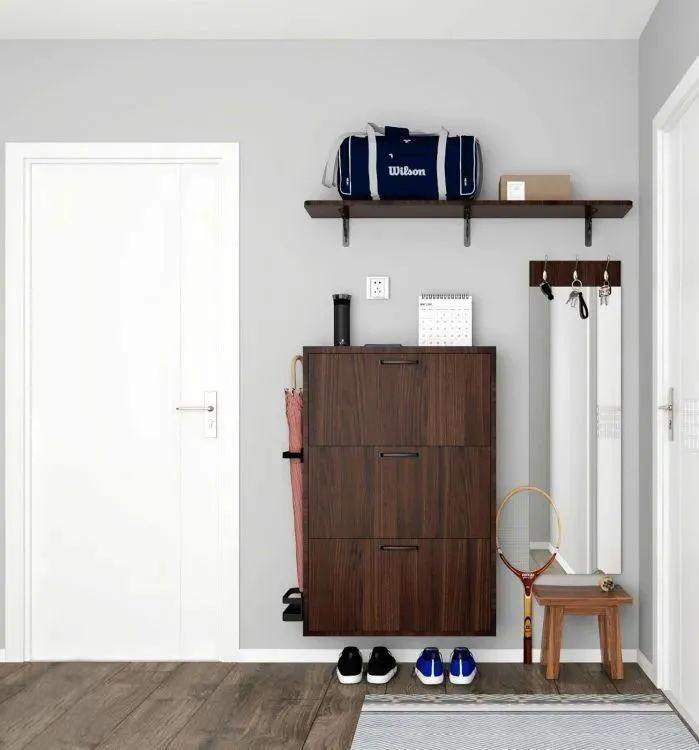 11. 進門凹位設(shè)計矮柜,底部留空放常用鞋。