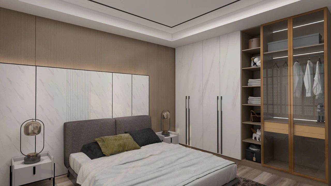 利用臥室設計嵌入式全鋁衣帽間,將整個柜體融入墻里,柜體與墻面保持一致,既不占用原本的臥室空間,又保證儲物空間極致應用;柜門選用膚感白鋁門板,營造出靜謐樸素的臥室環境,透明玻璃對開門,讓衣物了然于眼前,提升臥室高貴氣質感。