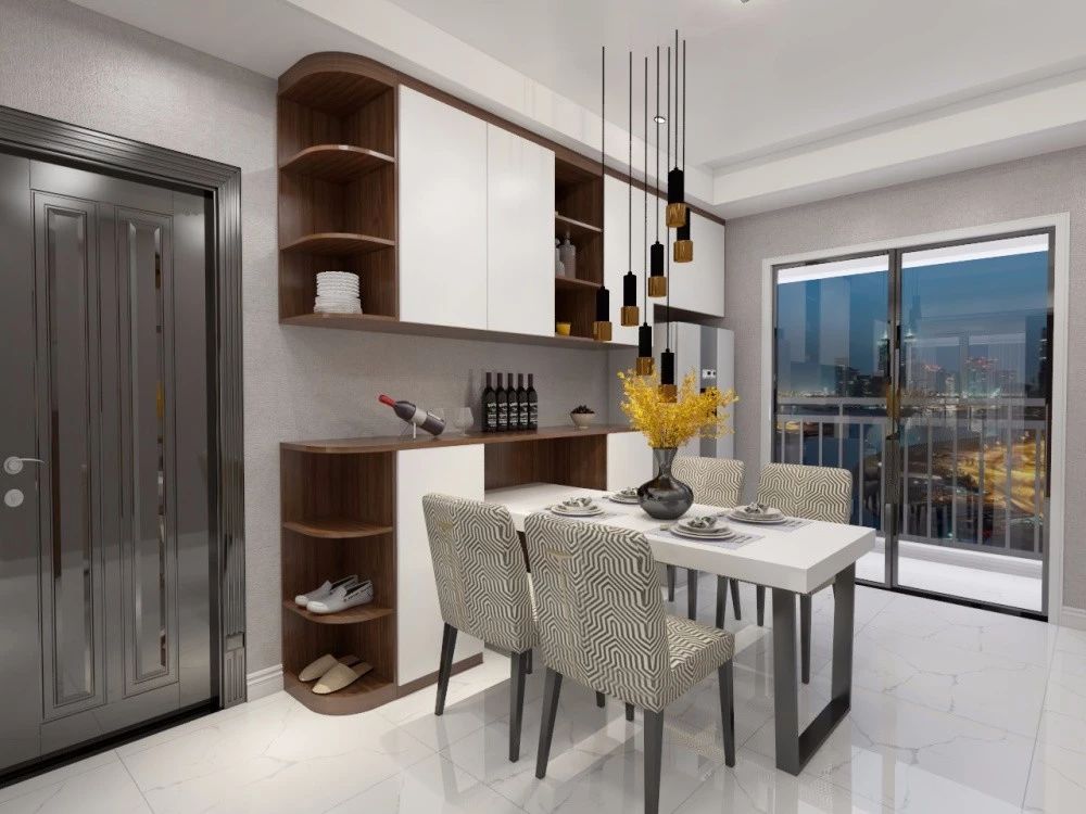 如果餐廳靠大門,那正好把玄關也合并起來。充分利用墻體轉角空間,打造L型餐邊柜,靠門的那一面墻用作玄關。