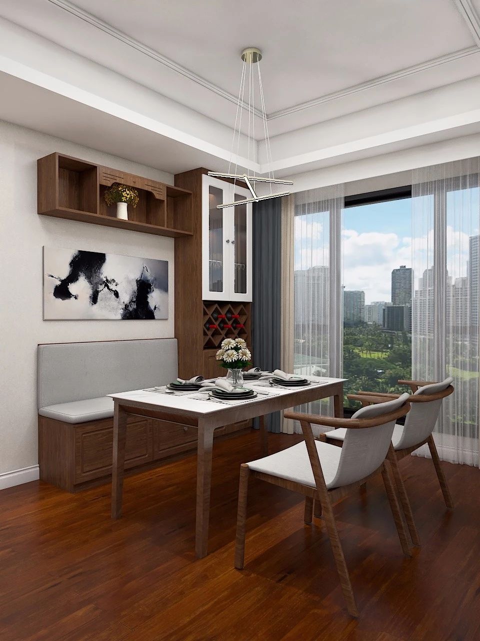 卡座式餐邊柜可以說是小戶型餐廳的救星,不但能增加用餐區的收納能力,還能增添用餐情調。定制吊柜上墻,收納展示兩不誤。卡座肚里還能“撐船”,收納力up!