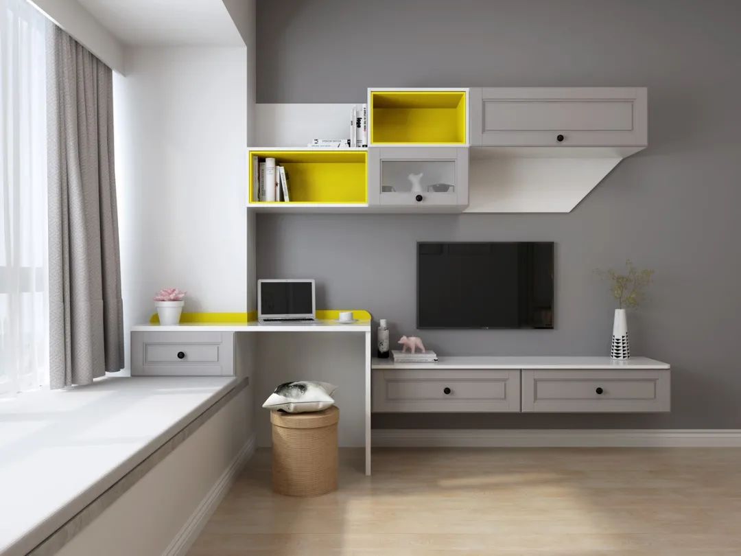 一般書桌的高度為75cm左右,飄窗不夠高的情況下,可以延長桌腳來墊高。或者在飄窗臺上打造抽屜桌,往外凸出至少30cm的桌面寬度,預留出放腳區(qū)域,這樣坐著才比較舒適。