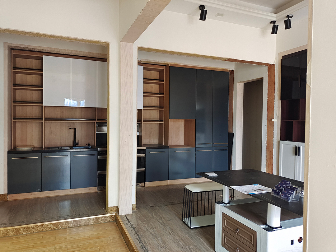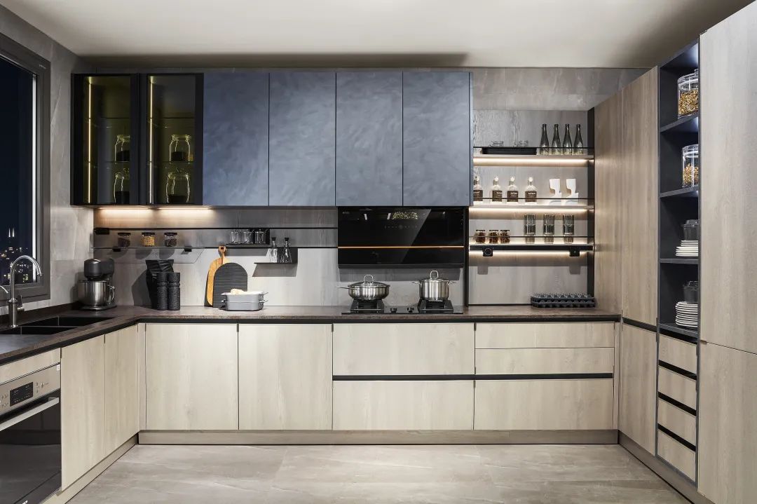 如果不喜歡柜門之間留槽的話,也可以選擇這種L型拉手,L型鋁拉手搭配抗油污蜂窩板,高端大氣上檔次!