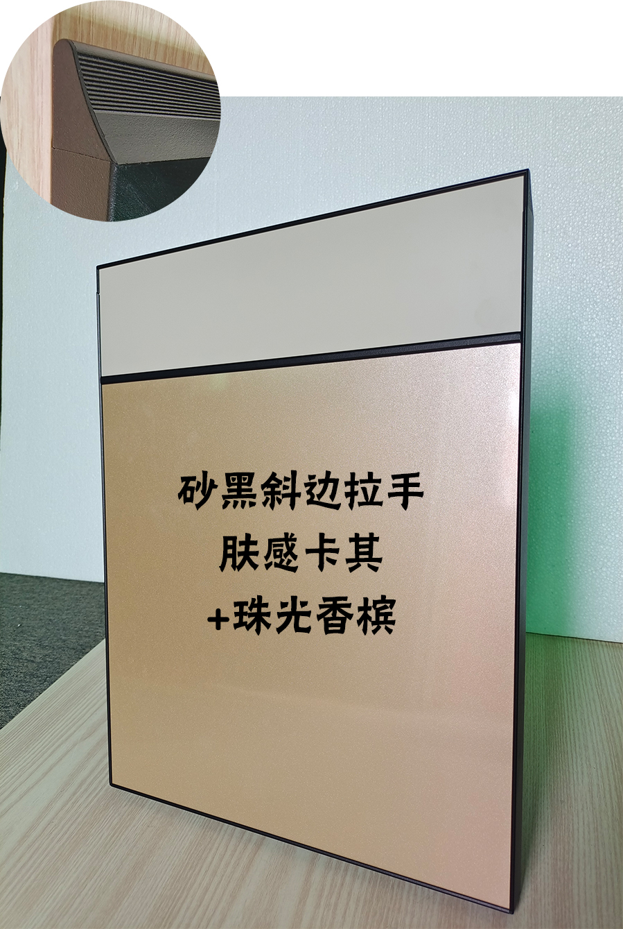 柜門的門框料是斜著變薄的鋁型材,這種設計非常高級,既看不到門把手又方便閉合,美觀大方。