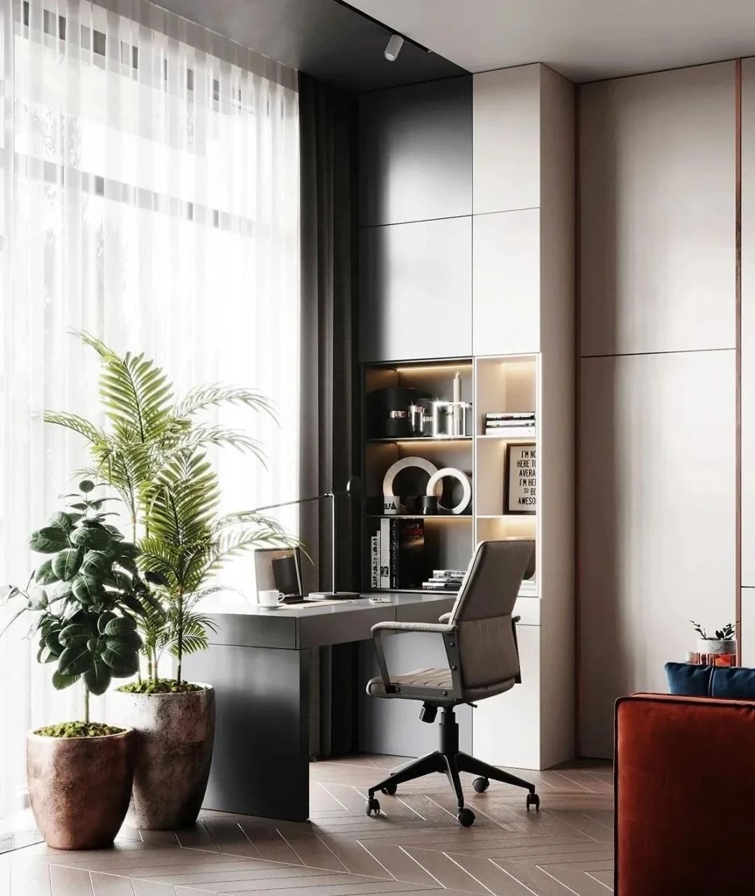 工作是嚴謹的、認真的、一絲不茍的,工作陽臺同樣如此。因此,工作空間的全鋁陽臺柜,以冷靜理性的色調,塑造嚴肅的空間。