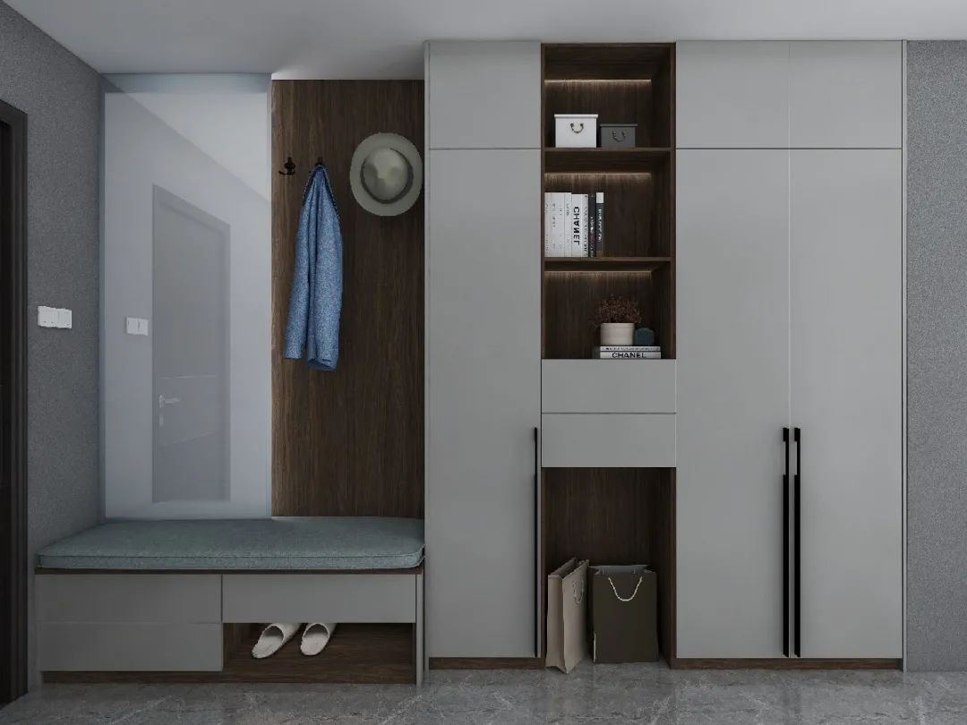 既是隔斷柜又是全鋁鞋柜,一柜到頂,大大增加了收納空間還顯得大氣簡潔。再配上換鞋凳,實用又美觀。