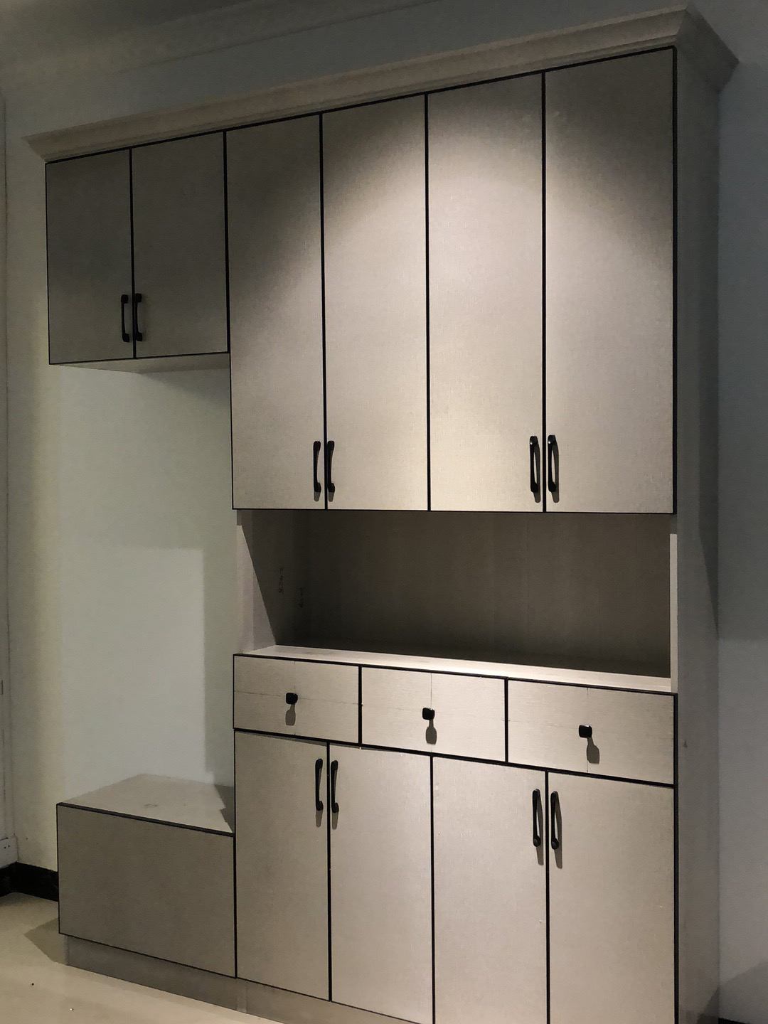 玄關處大多是全鋁鞋柜和吊柜的一體式,下面是全鋁鞋柜、上面是全鋁吊柜、中間還能留出掛衣服的空間,這樣的設計比單純的全鋁鞋柜更人性化。
