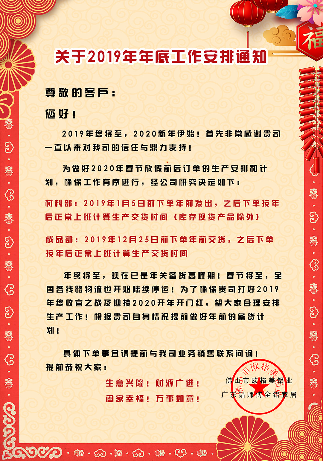 2019年關將至,已進入備貨高峰期,考慮到物流即將陸續停運,歐格美鋁師傅全鋁家居關于2019年年底工作作如下安排: