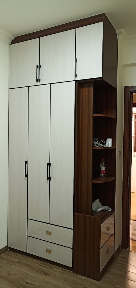 這款衣柜是今年比較流行的款式,黑白灰搭配金色拉手設計,移門可以節約空間,內部結構設計也是非常人性化,功能齊全,深受80/90后喜愛。