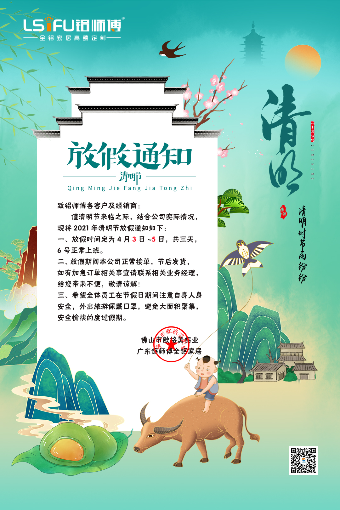 在這春意盎然的四月,即將迎來我國民間重要的傳統節日——清明節!這是中華民族緬懷先人、祭祀祖先的傳統節日。歐格美鋁業鋁師傅全鋁家居結合公司實際情況,現將2021年清明節放假通知如下: