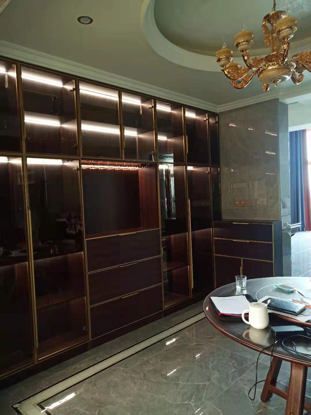 這是一套復式結構的房子,分上下兩層。上圖是餐廳的餐邊酒柜(拍照效果沒有實物漂亮),柜體是深色木紋色北歐紫檀,內(nèi)嵌感應燈帶,搭配金色20極簡窄框玻璃門,盡顯輕奢質(zhì)感!