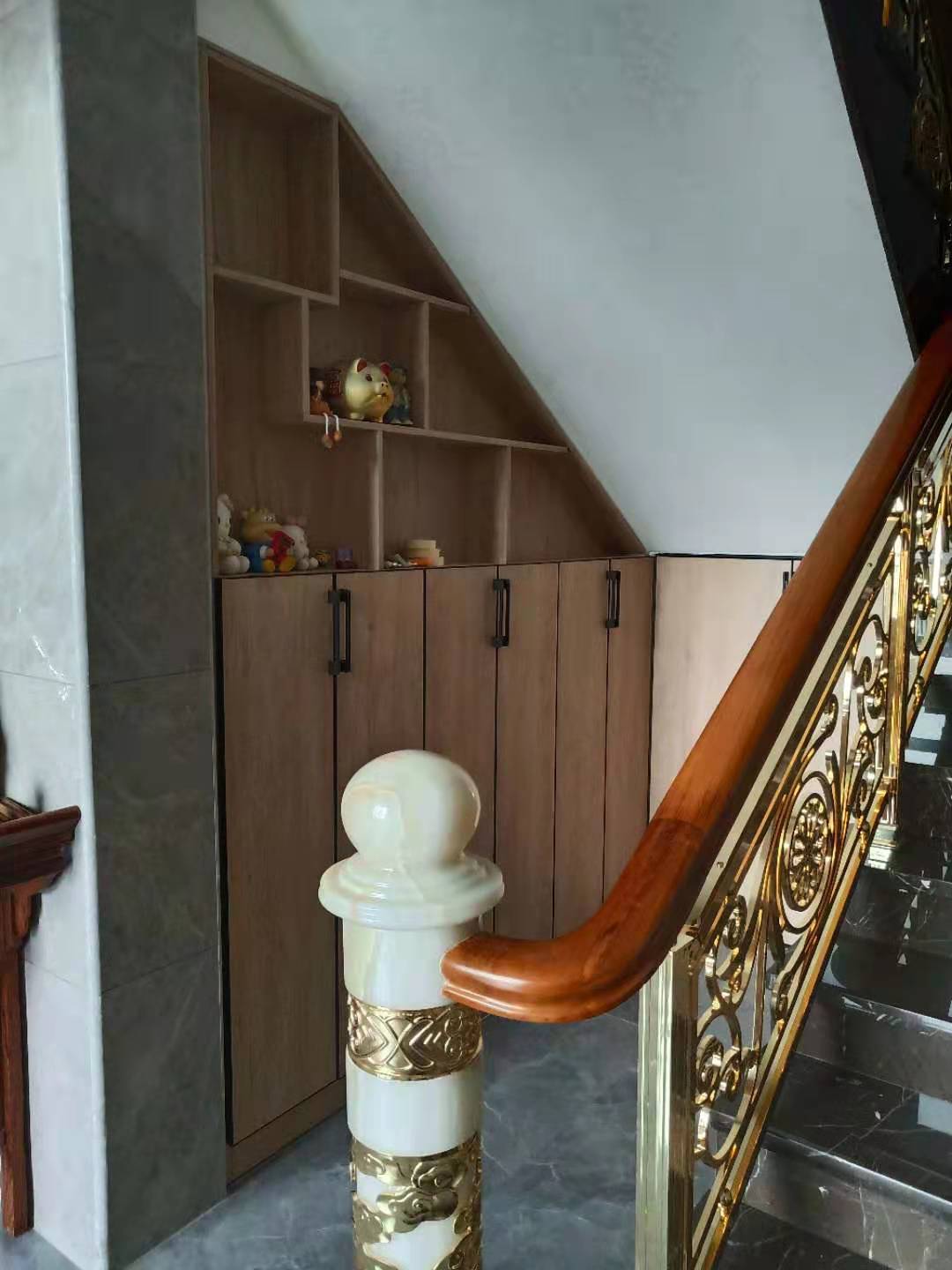 在寸土寸金的房價前,樓梯這個地方怎能放過,根據(jù)戶型在樓梯這里做了一個組合型樓梯柜,柜體和門板都是北歐榆木,簡單大氣。靠墻這邊下柜放鞋,上柜做成開放格可以充當書架和玩偶架。