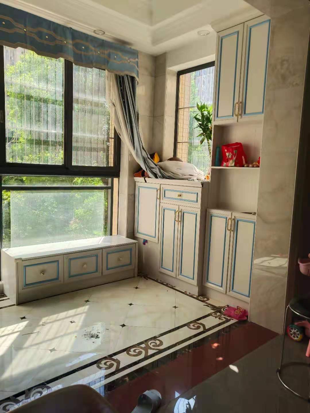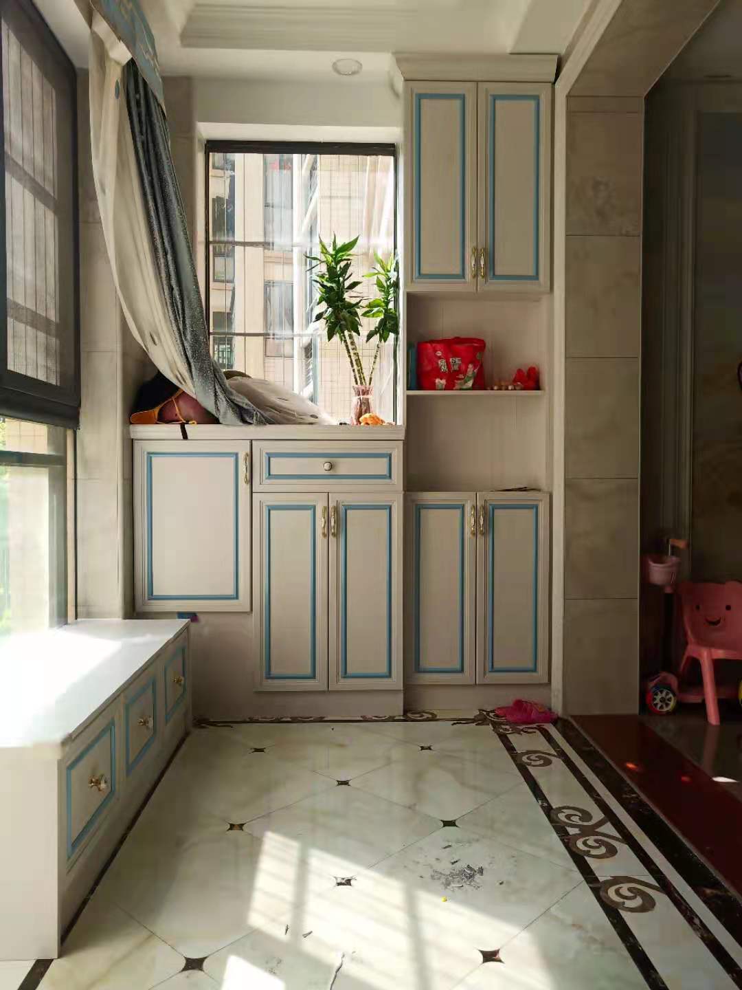 在陽臺區利用陽臺凹位定制一個嵌入式全鋁儲物柜,北歐書香桐柜體搭配45框+藍色邊框門板,去掉傳統歐式的繁復,簡單造型更耐看。到頂柜中間做兩個開放隔層不壓抑,旁邊地柜齊窗臺設計,靠落地窗的一邊定制了一個45公分高60公分寬的坐凳柜。