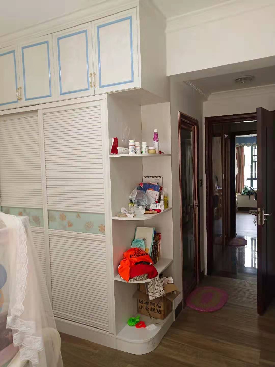 主臥的移門衣柜顏色與陽臺柜相呼應,百葉移門用玻璃腰線點綴,轉彎的一邊設計了開放格圓弧設計,不怕磕碰可以放些常用的物品,吊柜放棉被等過季衣物。