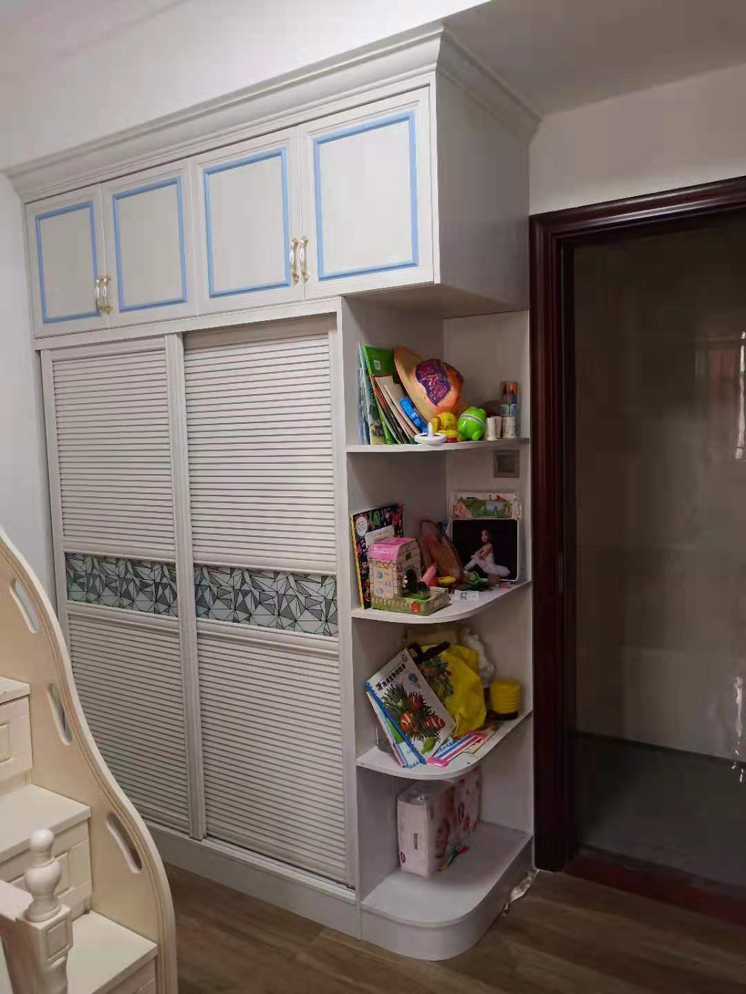 這是兒童房移門衣柜,與主臥衣柜風格一致,只是細節做了稍微變動,轉角靠門的一邊也做了圓弧設計,吊柜門板也是45框+藍色邊框門板,整屋家具整體和諧統一。