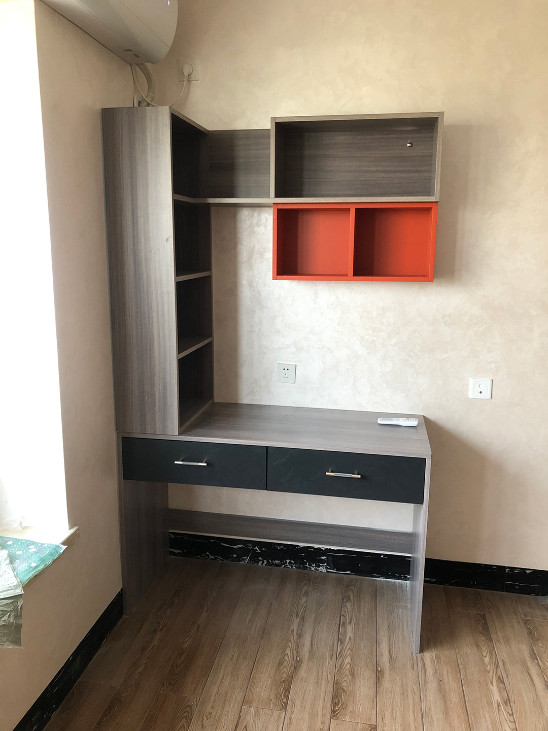 床的對面靠窗做了一個書桌柜,還可以當梳妝臺用,北歐松木灰柜體搭配膚感深灰色隱框門板,書桌上的吊柜做開放格,放書籍拿取更方便,兩個愛馬仕橙開放格做點綴,整體更有層次感。