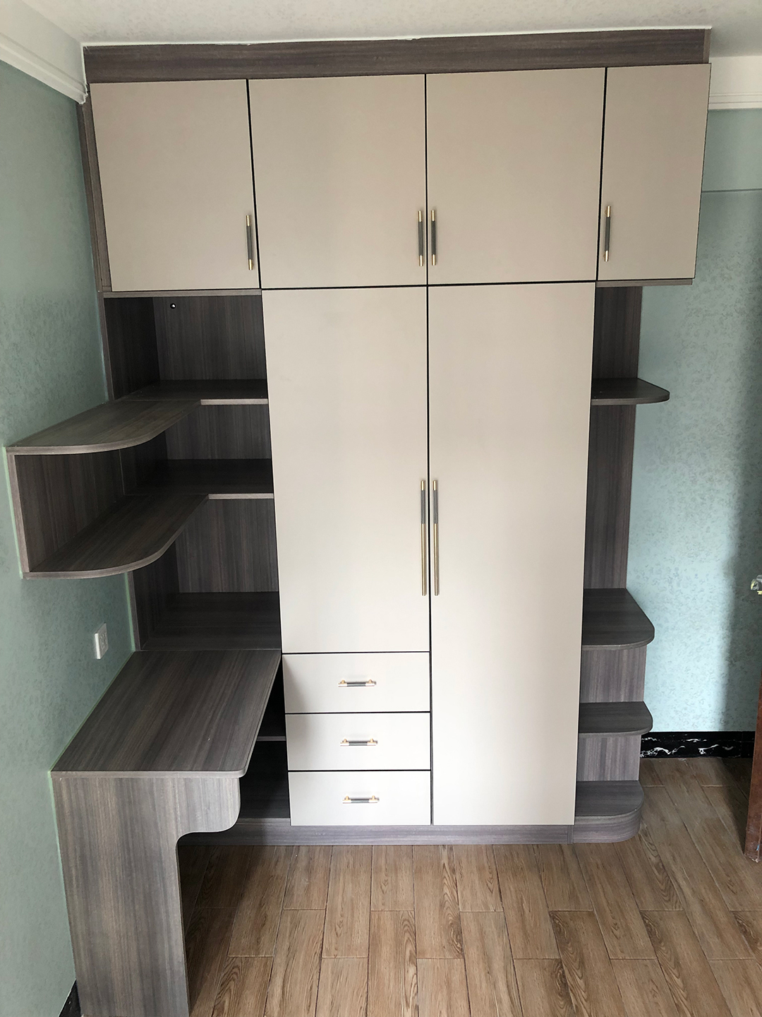 兒子房家具是全鋁衣柜+書桌柜組合,封閉與開放相結合,焊接整板北歐松木灰搭配膚感卡其門板,金色圓柱拉手做點綴,邊角圓弧設計更人性化。