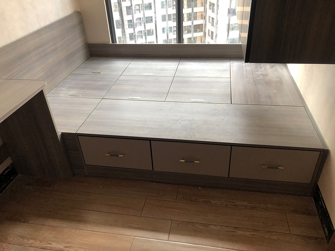 書桌旁是榻榻米床,榻榻米床上方做了一個大吊柜當衣柜(如下圖)