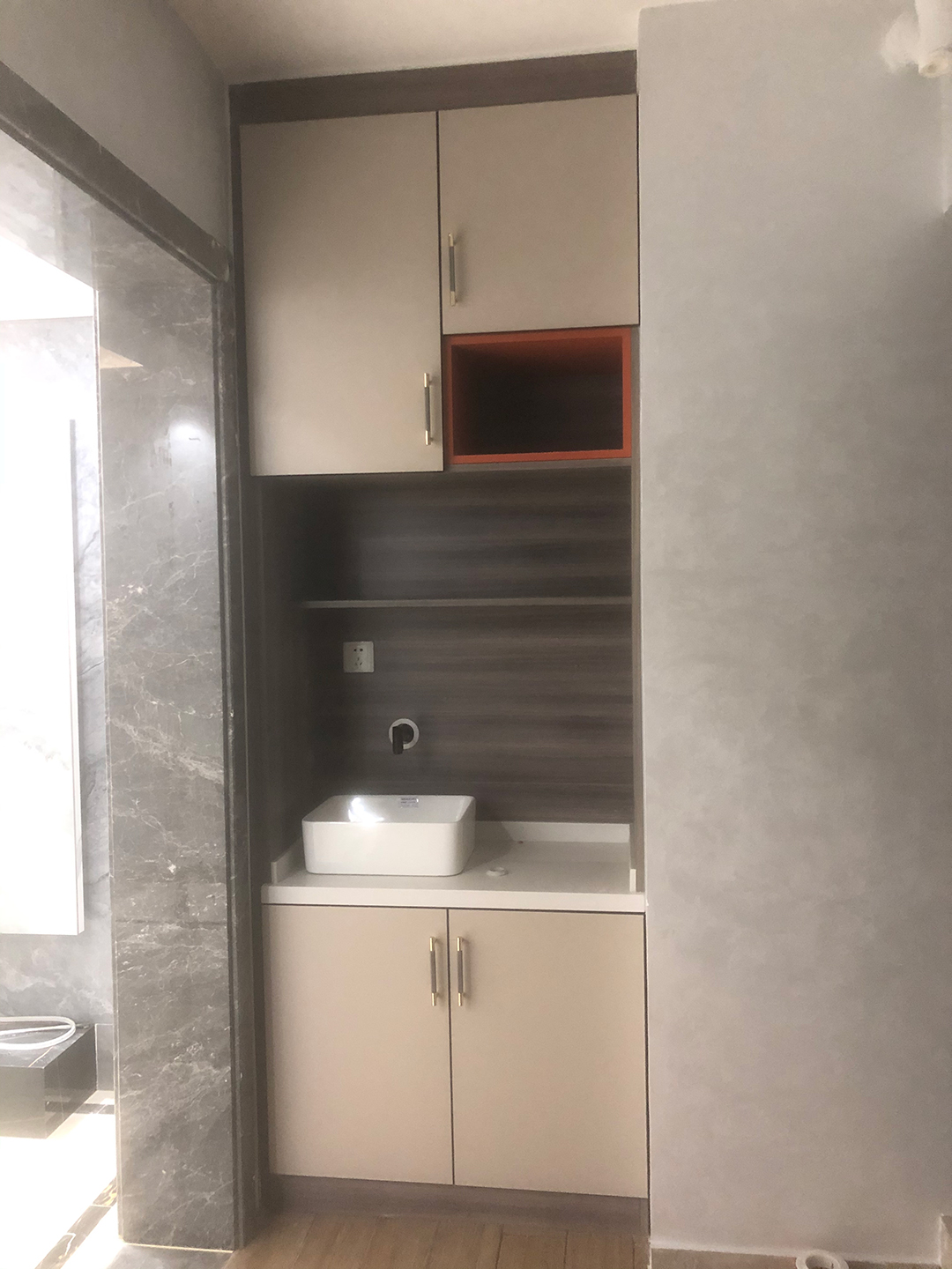 餐邊酒柜的顏色與入戶鞋柜相呼應,增加了玻璃門使整個柜體更有層次感,更多的開放格用來展示主人的喜好與收藏。中間挖空部分也做了一個較薄的星空灰開放格用來擺放小物件。