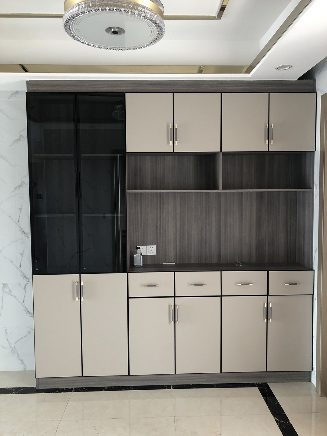 柜體采用焊接整板北歐松木灰,門板用膚感卡其搭配黑色窄邊框,金色圓管小拉手時尚又簡約。餐邊柜中間挖空,可作為入戶中轉站放包包鑰匙等解放雙手,下柜以封閉式掩門為主,可充當鞋柜,上方以半開放式為主,玻璃門擋住灰塵,但擋不住主人收藏品的展示。