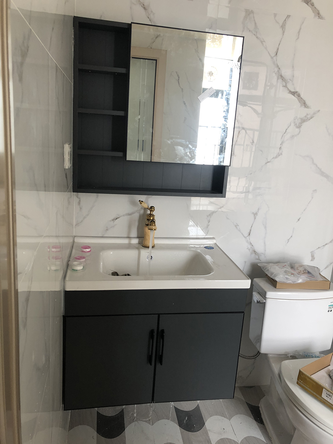 公衛也采用壁柜式全鋁浴室柜,柜體和門板都是星空灰,鏡柜增加收納,全鋁浴室柜防水防潮防蟲蛀,結實耐用不變形。