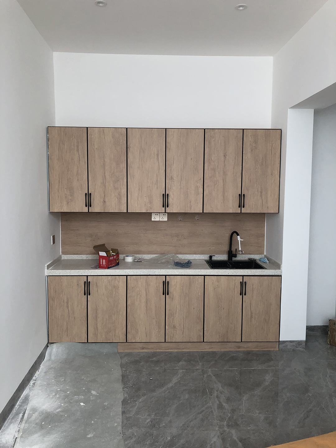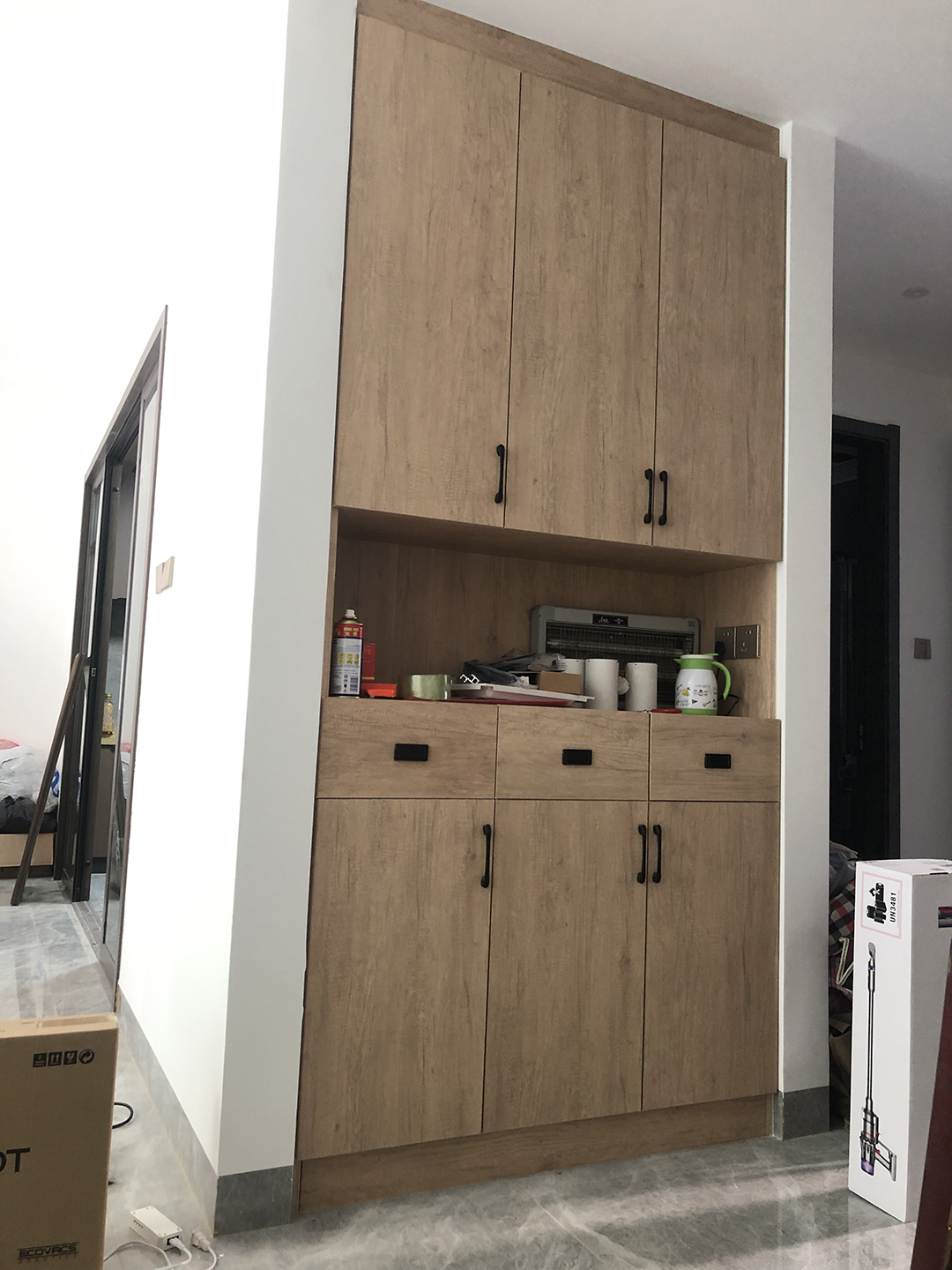 這是別墅負一樓停車場轉角儲物柜,地柜和吊柜組合,柜體和門板都是北歐榆木,極簡門框,線條感十足,簡約大氣。洗手池設計實用指數100分,由于近幾年疫情斷斷續續,大家也養成了回家洗手的習慣。