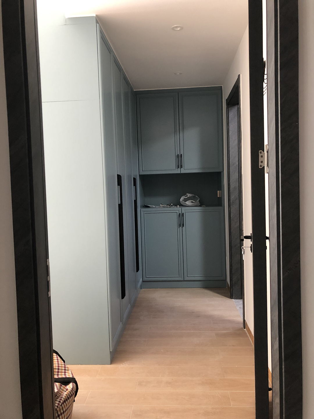 主臥入戶做了一個轉角衣帽間,更具隱私,柜體和門板都是肌膚藍,60框門板搭配一字型黑色拉手,高端大氣,一邊中間挖空設計,整體不壓抑。
