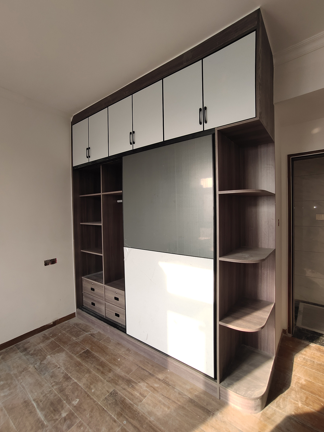 主人房衣柜采用上掩門下移門設計不占地方,柜體是北歐松木灰,移門用珠光閃銀白和珠光閃銀灰拼色,衣柜內部設有懸掛區、折疊區和抽屜私密區,轉角的地方做開放式弧形層板不怕磕碰,層次感更強。