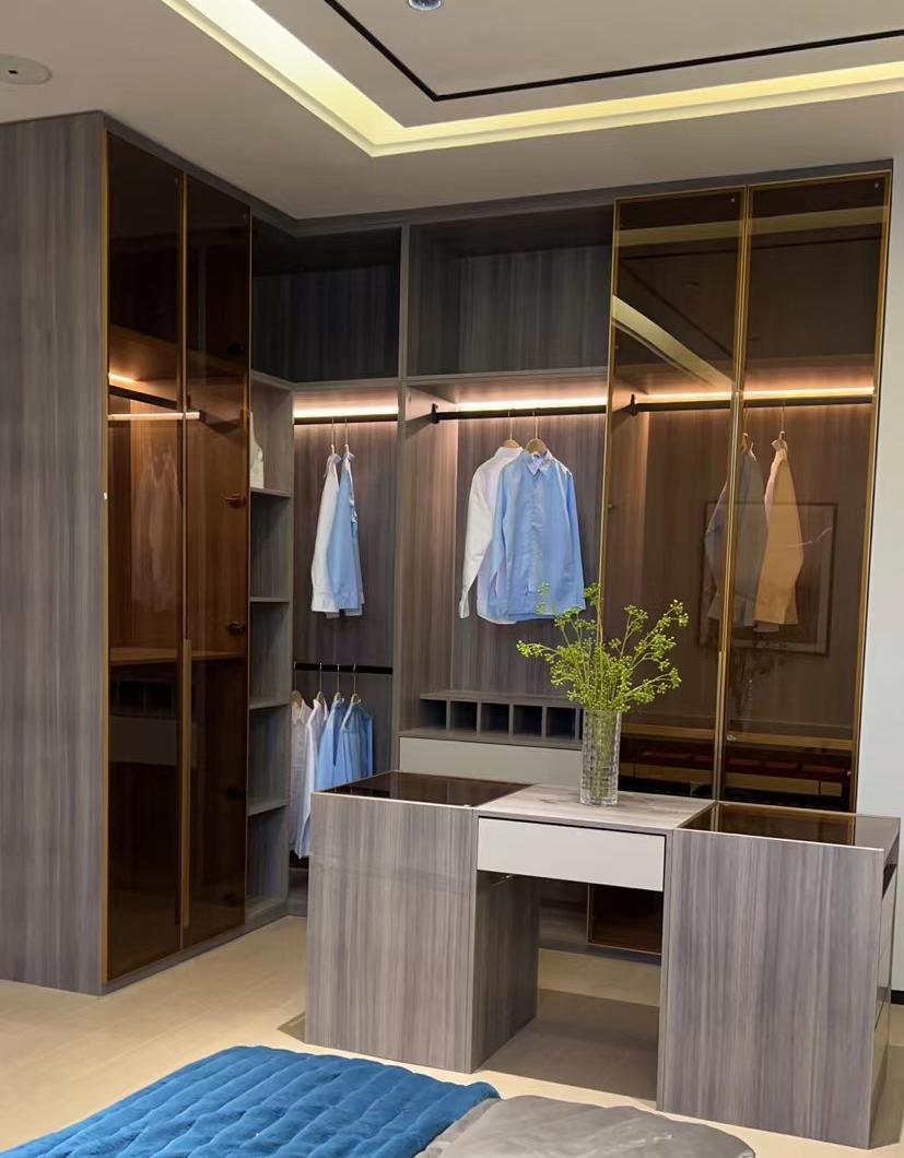 這個客戶定制的是輕奢風格,衣帽間色彩搭配是亮色系,一進屋抬眼看時眼前一亮,柜體主題色用的是北歐榆木和愛馬仕橙,加上燈帶后,氛圍感拉滿。中間是白色門板,裝上茶玻的柜體,頗有寧靜致遠的風格,低調輕奢。整體并不會覺得因為顏色多而產生視覺亂的感覺。