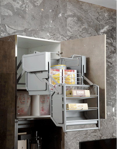 當(dāng)櫥柜遇到L型/U型布局時,轉(zhuǎn)角空間很容易被浪費(fèi)。這時候,轉(zhuǎn)角拉籃了解一下,分分鐘體驗(yàn)感爆表。
