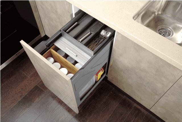 以往的地柜用兩層擱板就算完事,每次取物都好像在做“起立蹲下”,平白增加了不少勞動量。于是就有了拉籃這個設(shè)計(jì),在收納功能強(qiáng)大的同時方便好用,除了貴點(diǎn)沒啥毛病。