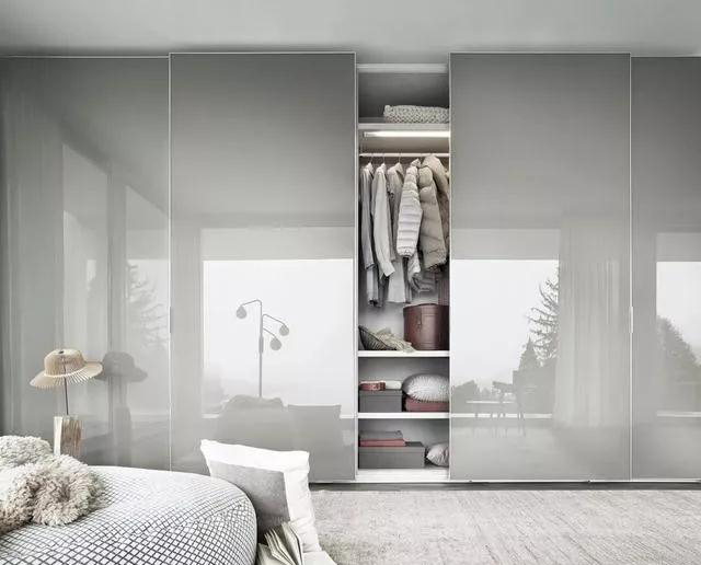 二、磨砂/烤漆玻璃衣櫥磨砂玻璃能夠創造朦朧美,讓衣柜空間不完全裸露。烤漆玻璃泛著淡淡的奶白色,讓人覺得很柔美,同時它能夠極好的隱藏起衣柜內部,保留了屋主更多的隱私。