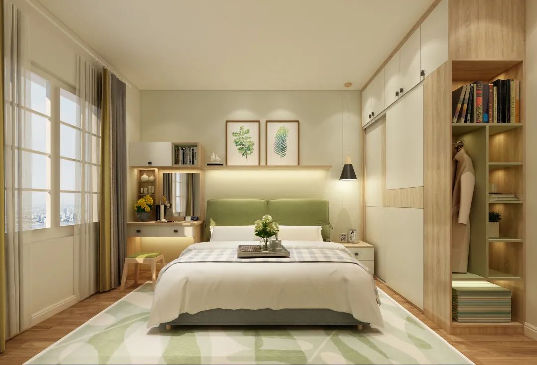 想要墻面保持色彩一致?這一次我們轉移到軟裝上~床屏、地毯、掛畫、梳妝凳,星星點點都有綠色的氣息,恰好,局部的開放格用煙雨綠作為點綴,不突兀反而很融洽。