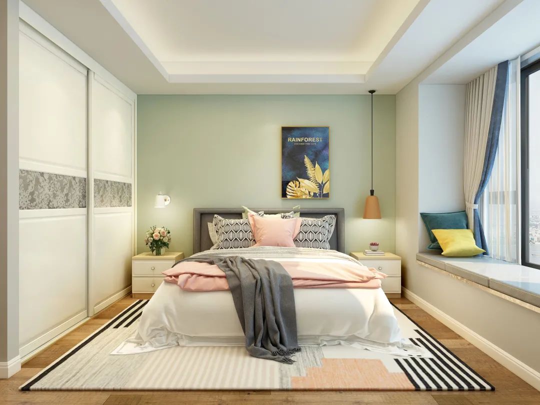 夏天的一抹綠,放在哪里合適呢?不防往墻上放......作為床頭背景,掛畫、吊燈給它增添溫馨感,簡簡單單的造型吊頂,給你最想要的那份輕松舒適感~