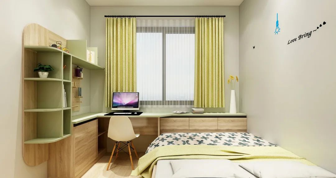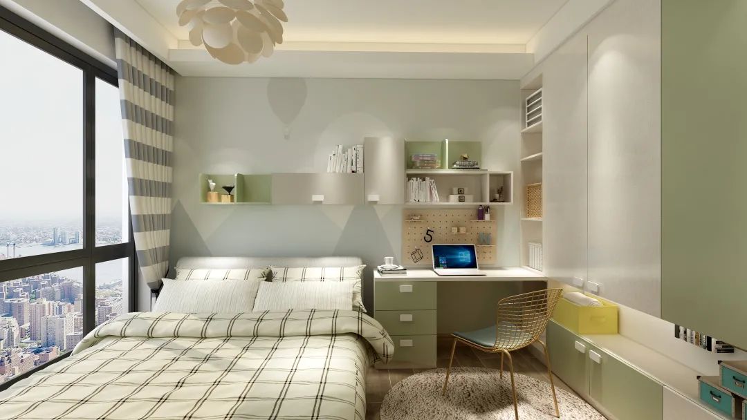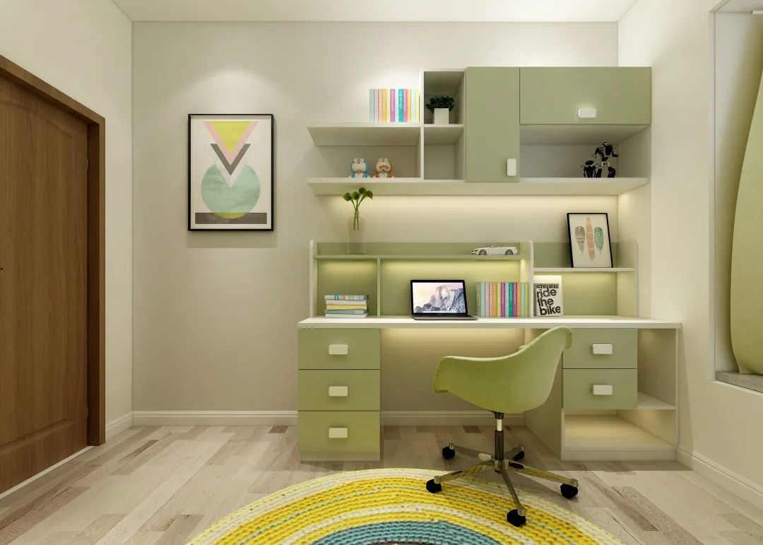 沿著綠線,這是個青少年房,跳色的設計,“綠”在柜門、抽面、開放格,跳躍的設計,就像不受拘束的孩子,自由自在,充滿活力。