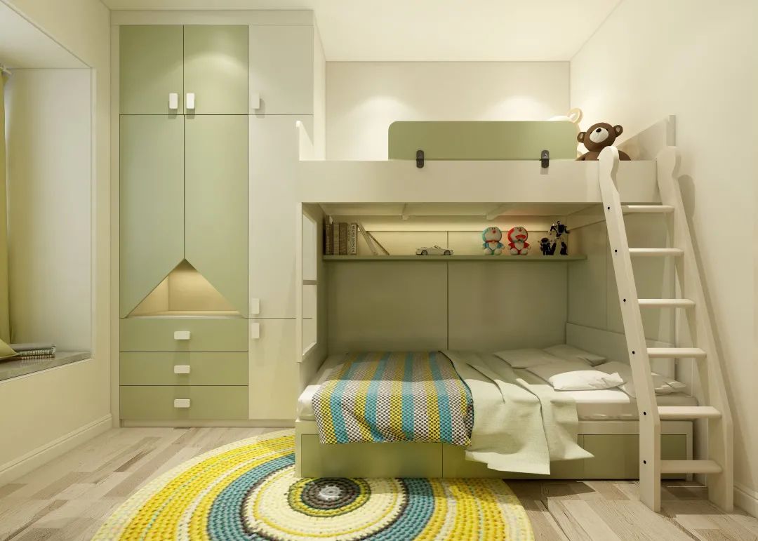 拐個彎,集上下床和衣柜一體的兒童房,不吝嗇地運用煙雨綠,可以看出這是空間的主色調,以白色作為緩沖,這樣的顏色運用很靈活。