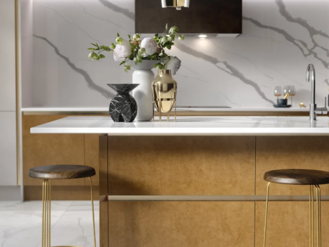 巖板是由純天然礦物組成且沒有樹脂粘合劑的人造石材,這也就意味著材料可分解和重復使用,因此巖板的環保性優于石英石,且耐高溫不易發生板材破裂。