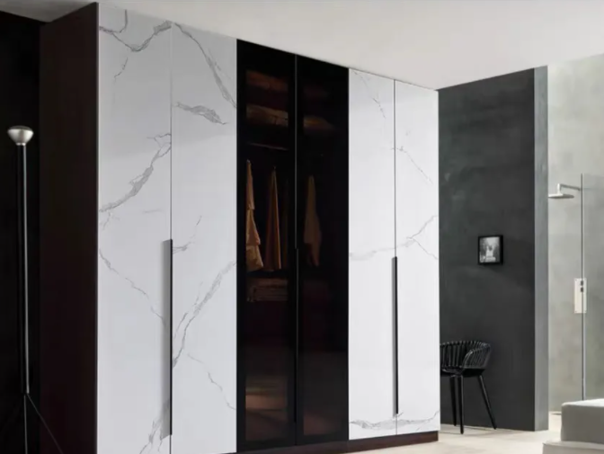 巖板可以應用在定制家居產品的柜門。衣柜的體積都較大,柜門所需的材料也比較大,巖板的大幅面規格非常適合作為衣柜柜門,由于巖板逼真的3D紋理和光滑的質感,輕松的營造出輕奢的風格。