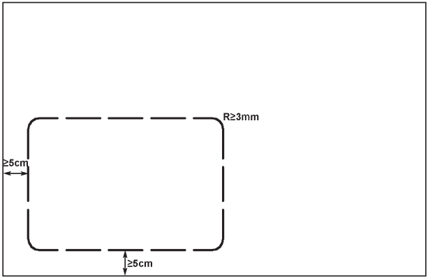 巖板開孔操作前,應檢查底部支撐是否穩定、水平,且在切割一側有足夠的支撐力。從孔至板材邊緣必須始終留有至少5 cm的距離,孔的圓角半徑應至少為 3 mm,見下圖。