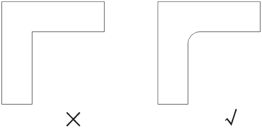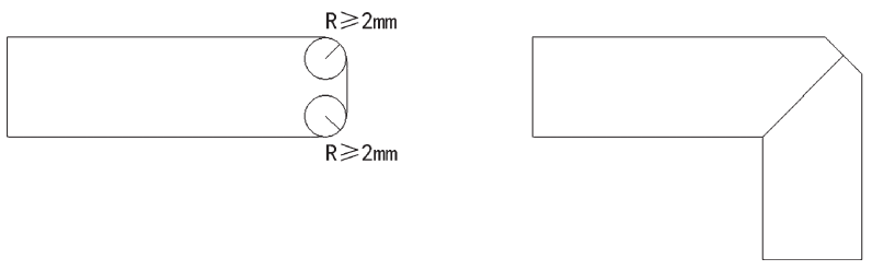 孔的圓角半徑越大,則該面板的結構承受力越大。相反,任何沒有圓角的孔內角都會在面板上造成應力點,因此不得切割無圓角的90度直角,見下圖。